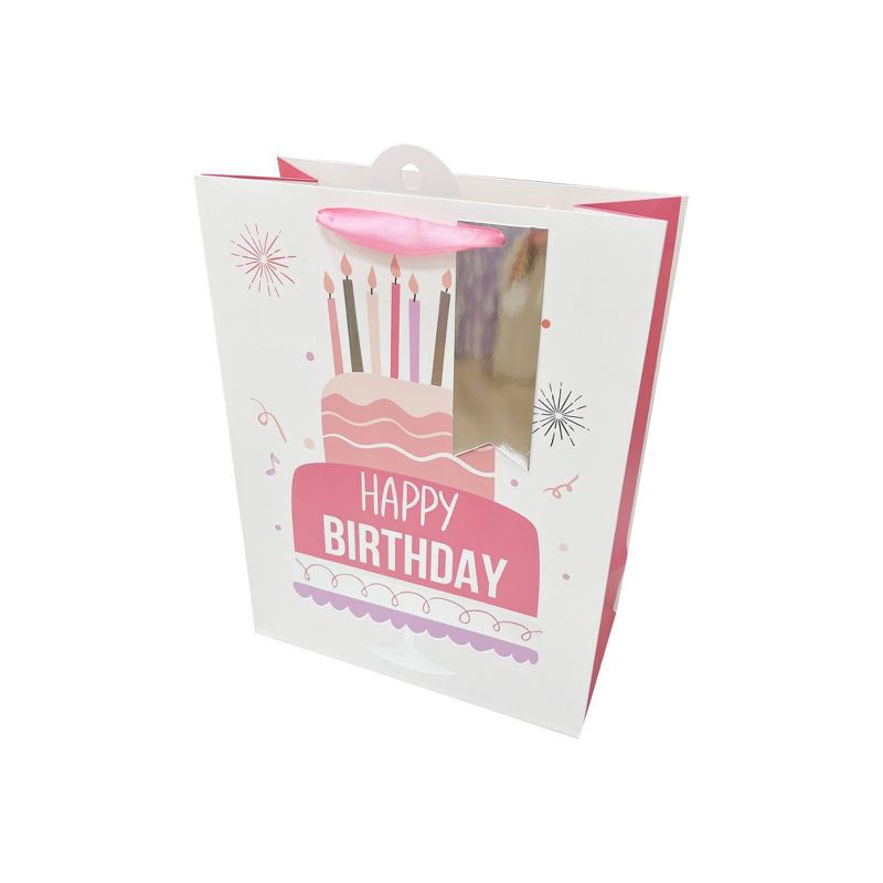 Bows And Sparkles Medium Foil Print 'Happy Birthday' Cake Gift Bag with Tag White/Pink/Silver