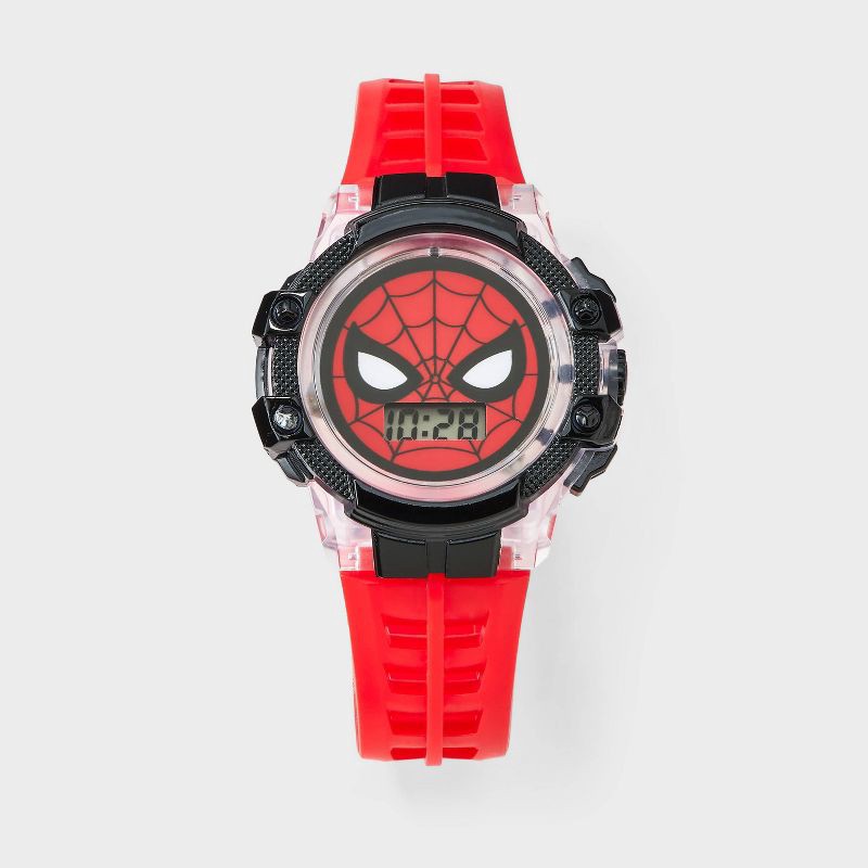 This Spider-Man Flashing LCD Watch in vibrant red color is perfect for young superhero fans. Featuring a digital time display, it makes time-telling fun and easy. The watch case is crafted from plasti…