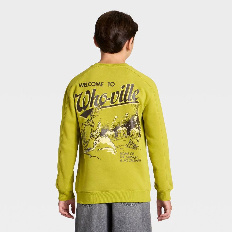 slide 2 of 4, Boys' The Grinch Whoville Front and Back Graphic Fleece Sweatshirt - Green S, 1 ct