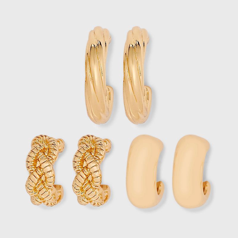 Add different designs to your earring collection with this Braided and Twist Textured Hoop Earring Set from A New Day™. This earring set in shiny and matte gold-tone finishes includes three pairs of b…