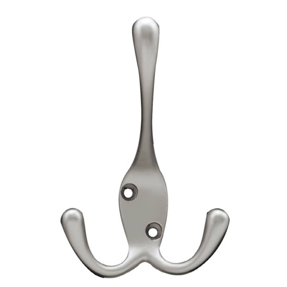 Made of high-quality zinc die-cast material. Mounting hardware included. Maximizes storage space with three hooks. Satin nickel finish.