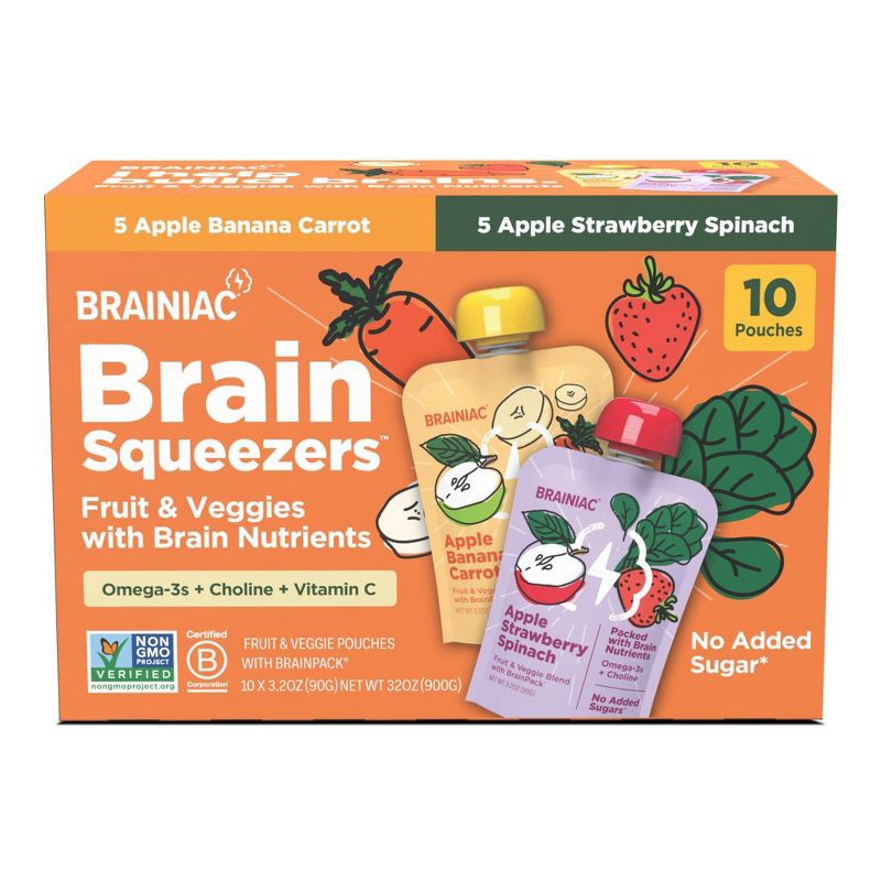 - A SMARTER KIDS' SNACK: Each box contains 10 x 3.2 ounce pouches of Brainiac® Fruit and Veggie Pouches with BrainPack® — a blend of key nutrients to fuel growing minds. Each Variety Pack includes 4 x Apple Carrot Banana, 3 x Apple Strawberry Spinach and 3 x Apple Berry Zucchini.