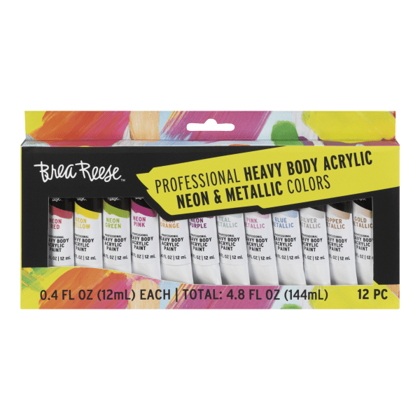 Brea Reese Professional Heavy-Body Acrylic Paint, Neon & Metallic, Pack Of 12