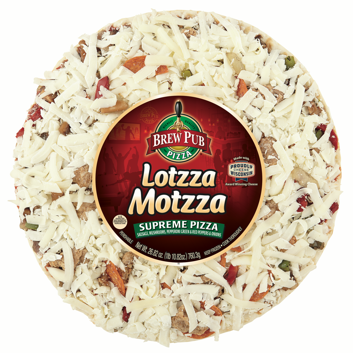Brew Pub Lotzza Motzza pizza is made with the hungry in mind. This Supreme pizza starts with a rich and savory tomato sauce on a crispy crust, topped with premium sausage and pepperoni, mushrooms, oni…