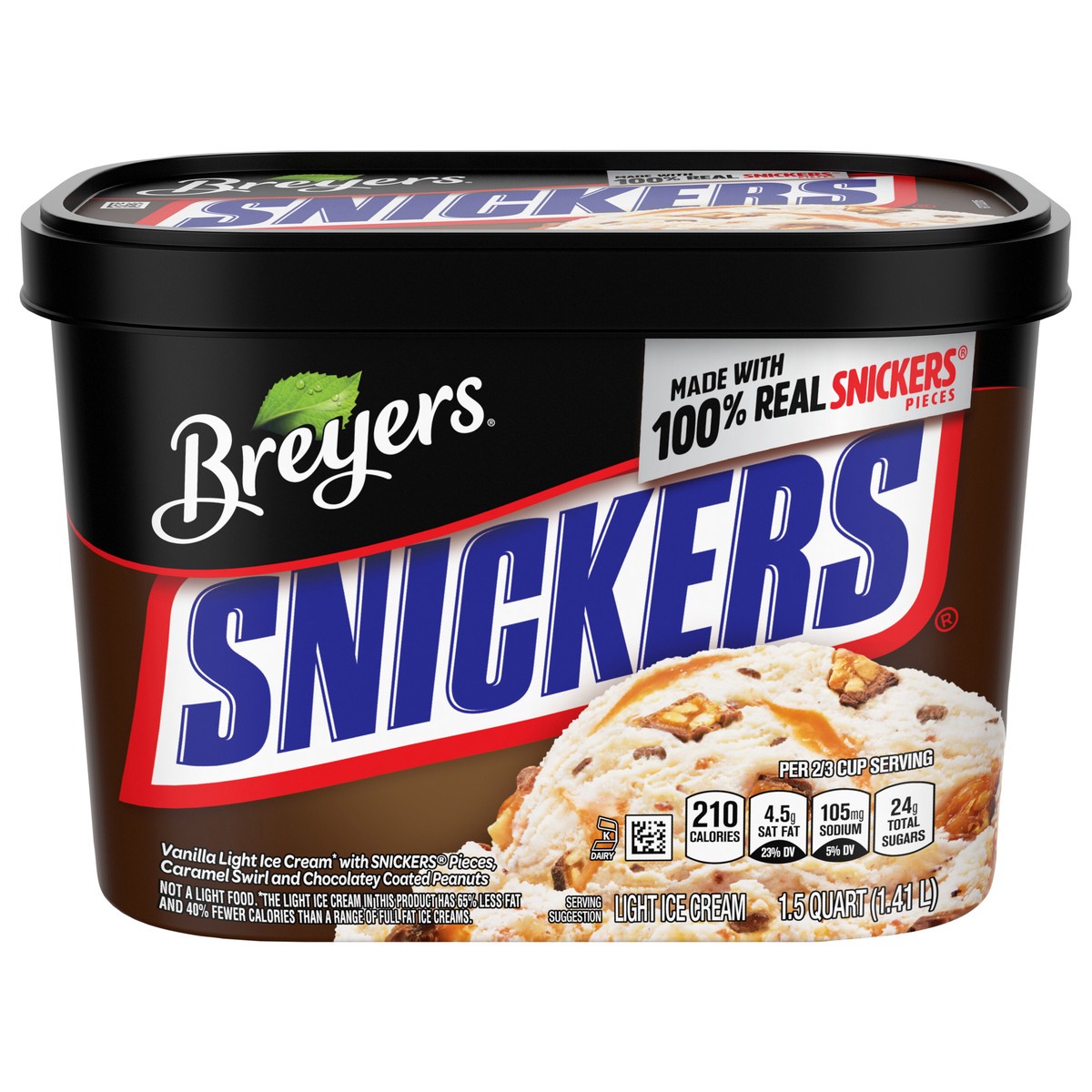 Breyers joins forces with America's favorite candy bar to bring you Breyers SNICKERS Light Ice Cream! Caramel ribbons, chocolate coated peanuts, and real SNICKERS bar pieces are swirled together with …