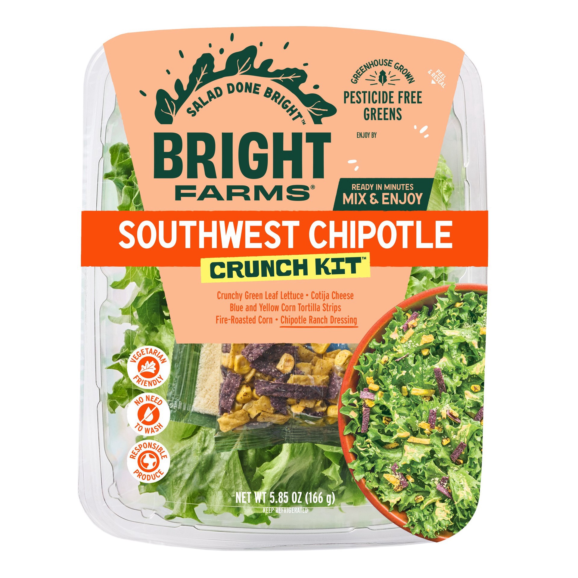 This kit starts with fresh BrightFarms Sunny Crunch greens grown right here in Texas! It's then topped with cotija cheese, blue and yellow corn tortilla strips, fire roasted corn, and paired with a ch…
