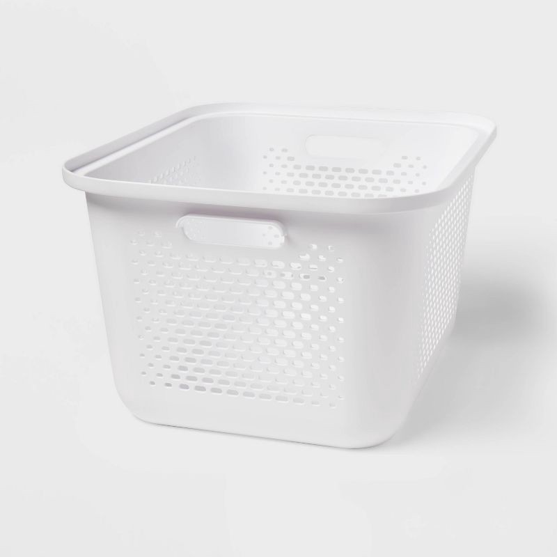 The Medium Decorative Plastic Bin with Cutout Handles from Brightroom™ gives you ideal storage for your craft room, kitchen or bedroom. The bin is perfectly sized to store accessories, books, crafting…