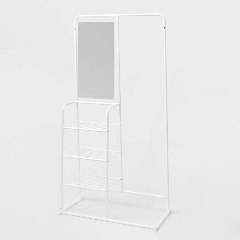 This Metal Garment Rack with Mirror and Shelving from Brightroom™ brings functionality and aesthetics to any space. This rack has a vertical space on the right to hang long garments like suits and coa…