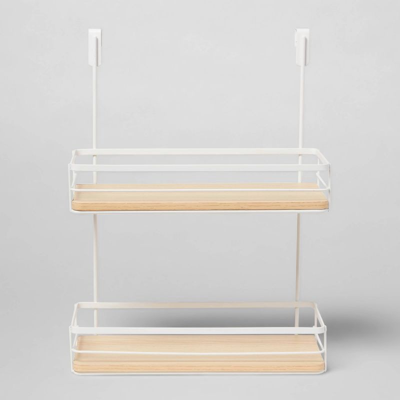 - Over-the-cabinet tiered shelves are great for keeping your bathroom space tidy and organized