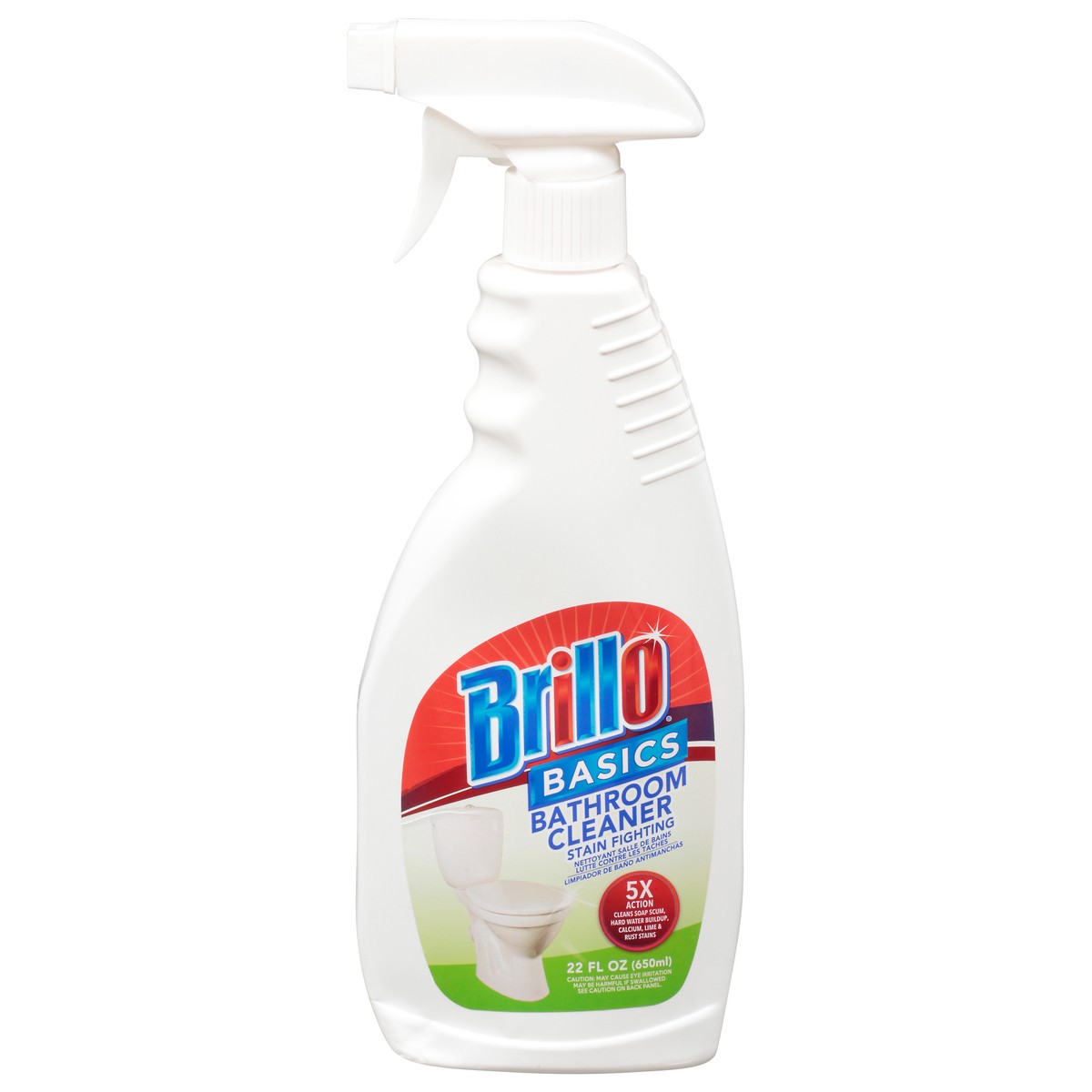 5x Action: Cleans soap scum, hard water buildup, calcium, lime & rust stains. Brillo Basics Stain Fighting Bathroom Cleaner is formulated specifically to destroy a variety of stains on a variety of su…