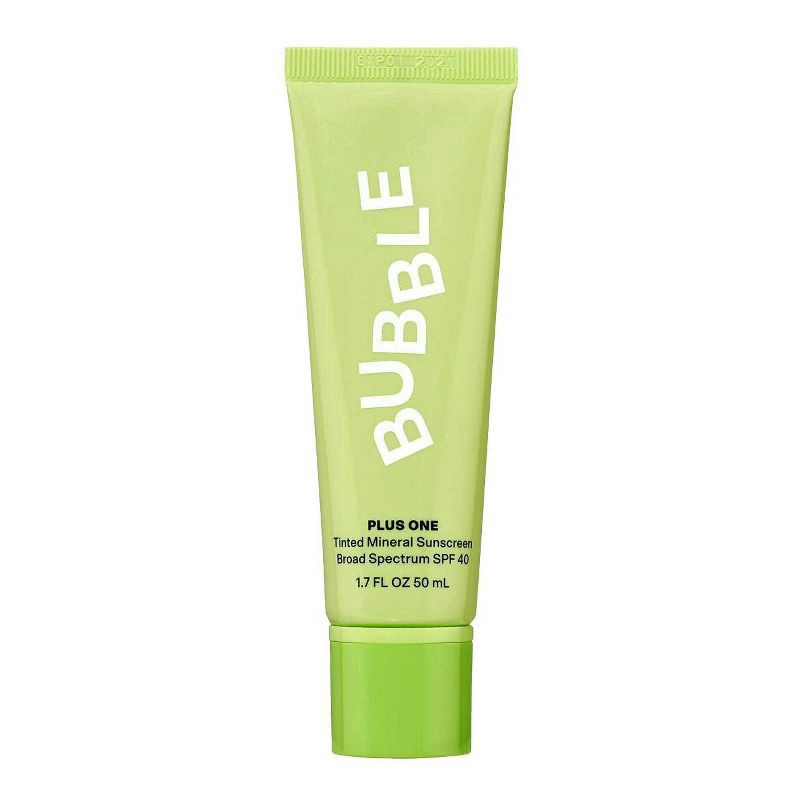 Bubble's Plus One Tinted Daily Mineral Sunscreen isn't greasy, won't clog pores, and does not leave a chalky white cast. The universal bronzy finish blurs & perfects your skin's appearance while the B…