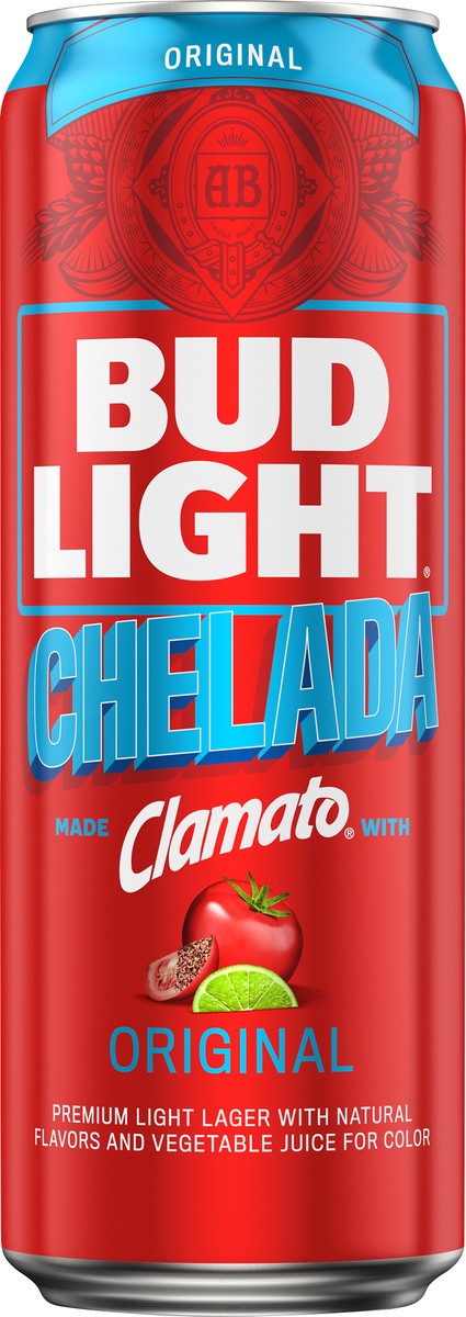 Bud Light lager beer with natural flavor and certified color. Per 12 fl. oz. Average Analysis: Calories, 151. Carbohydrates, 15.6g. Protein, 1.9g. Fat, 0.0g. The original made with clamato. Enjoy resp…
