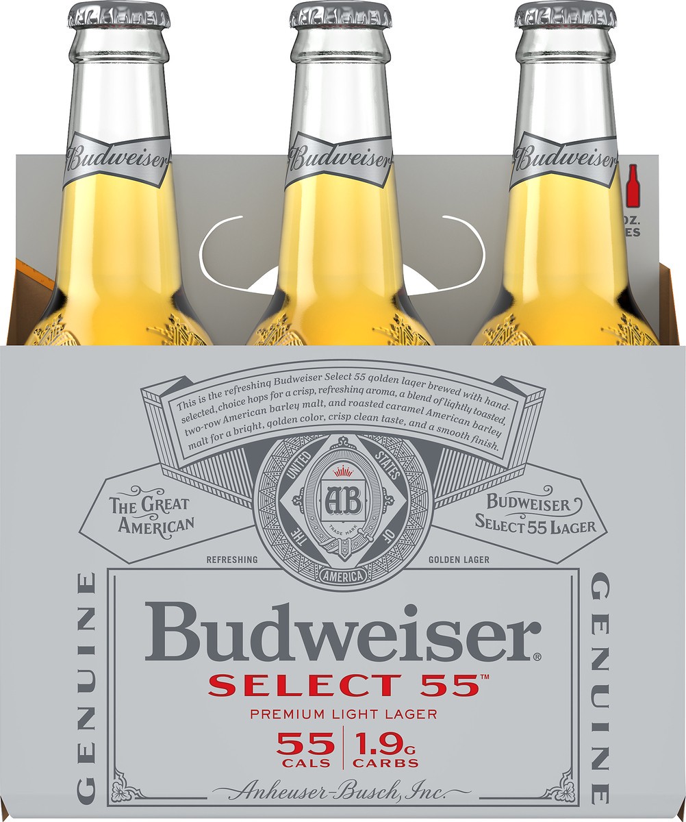 55 cals. 1.9 g carbs. Per 12 fl oz - Average Analysis: 55 calories; 1.9 g carbohydrate; 0.5 g protein; 0.0 g fat. This is the refreshing Budweiser Select 55 golden lager brewed with and-selected, choi…