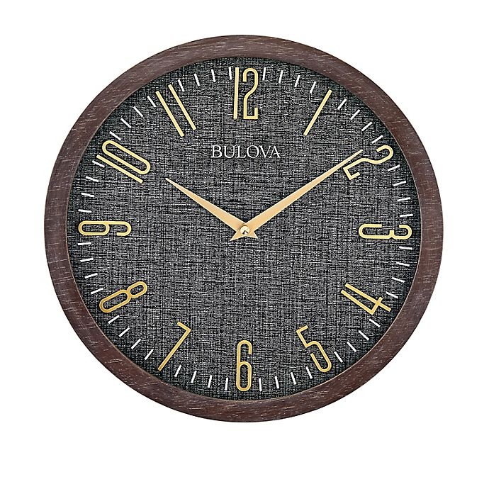 Add understated elegance to any wall with the Bulova Lowell Wall Clock. This unique clock features a round wood grain case in an espresso finish, complemented by a denim blue fabric face with raised g…
