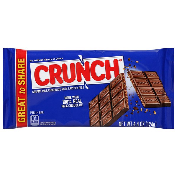 Creamy milk chocolate with crisped rice. No artificial flavors or colors. Per 1/4 Bar: 160 calories. See nutrition information for saturated fat content. Great to share. CrunchBar.com. how2recycle.inf…