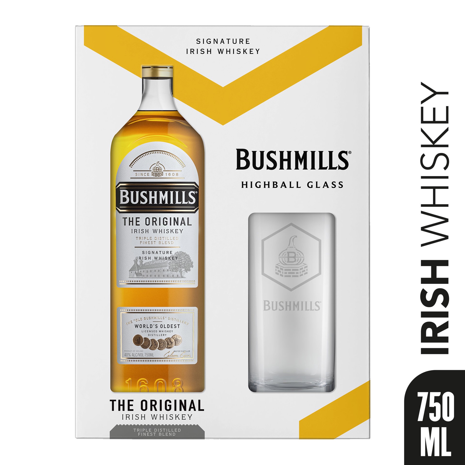 Bushmills® Original Irish Whiskey is triple-distilled single malt whiskey combined with an aromatic, lighter grain Irish whiskey, aged at least 3 years in Kentucky bourbon barrels & Spanish Oloroso sh…