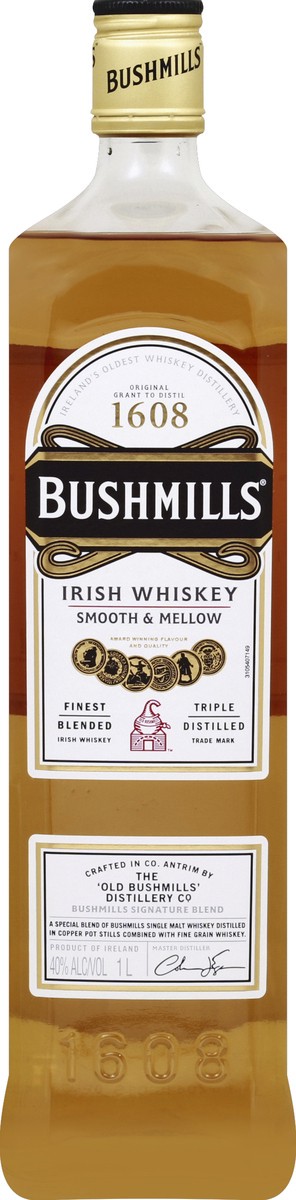 Triple distilled. Smooth & mellow. Finest blended. Original grant to distil 1608. Ireland's oldest whiskey distillery. Bushmills Signature Blend: A special blend of Bushmills single malt whiskey distiā¦