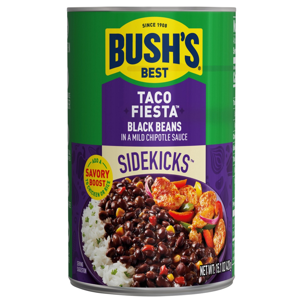 Your taco night will be the talk of the town with Bush's Sidekicks Taco Fiesta Black Beans. Slow-simmered in a rich sauce of chipotle seasoning, spices, corn and bell peppers, these flavorful black be…