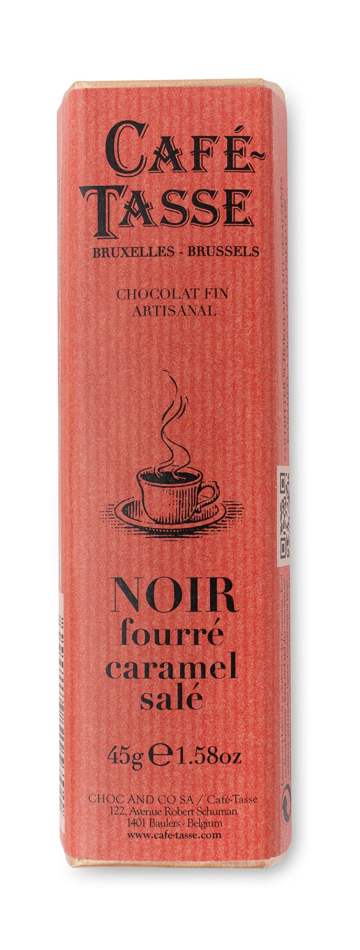 Dark chocolate bar with salted caramel filling. 45 grams of happiness to slip into your bag or to share with friends.