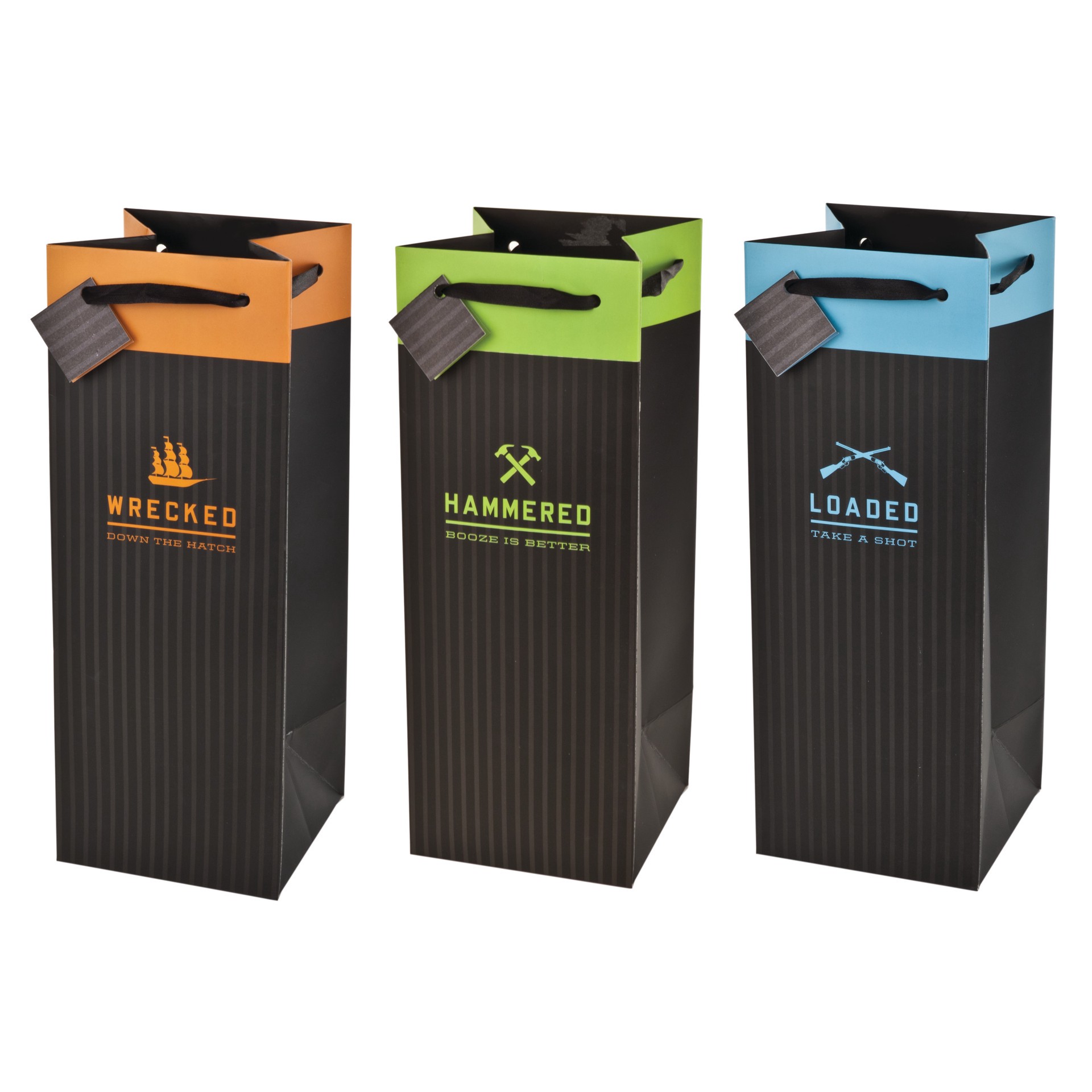 If you are wrecked, hammered or loaded - or if you want to be - these bags are for you.Satin ribbon handle230 GSM matte paperFits wine, champagne, & 1.5 L bottles