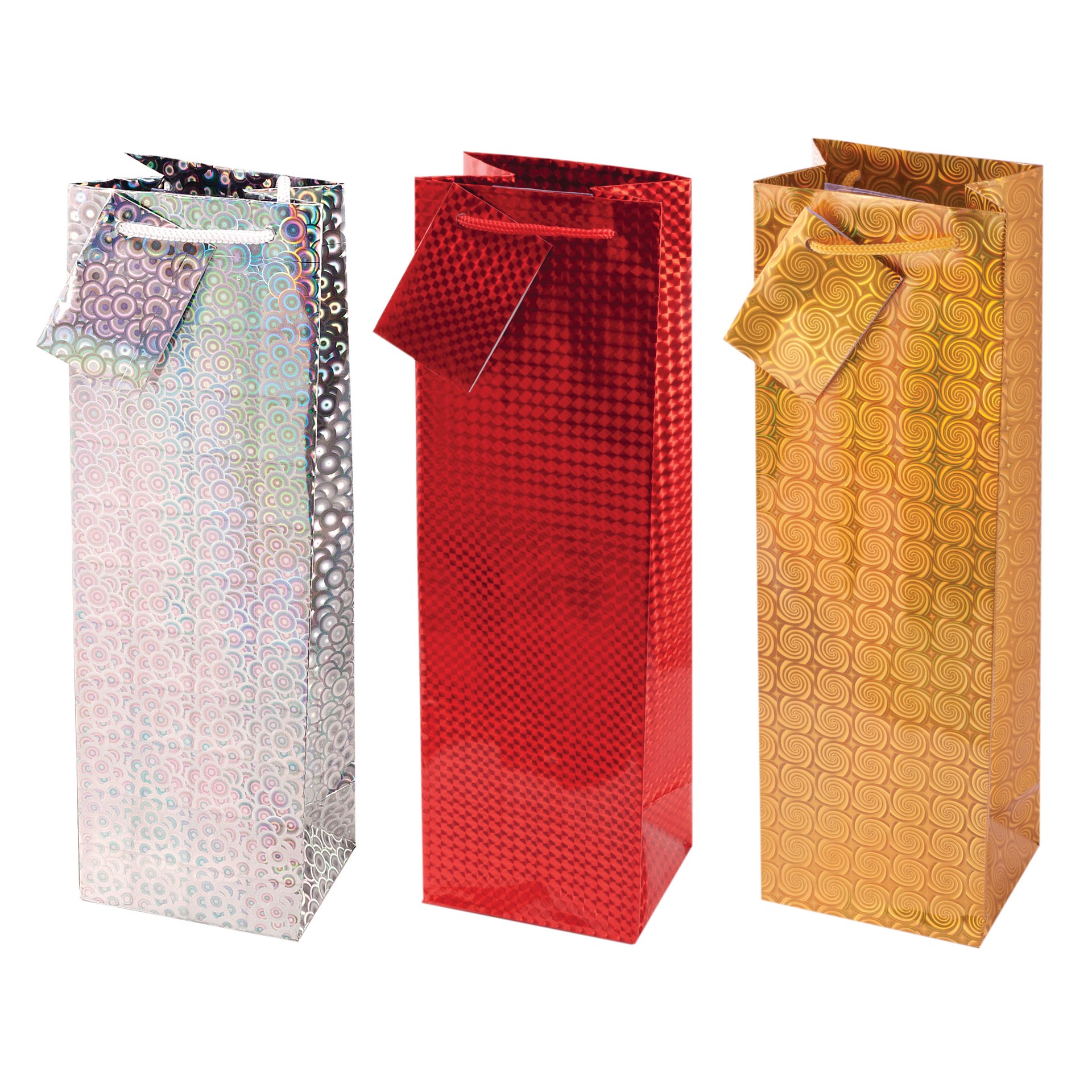 These metallic wine bags are sure to make any holiday sparkle. Each of the assorted three colors come with its own design and is outfitted with a rope handle.Rope handle157 GSM paperFits wine, 1.5 L &…