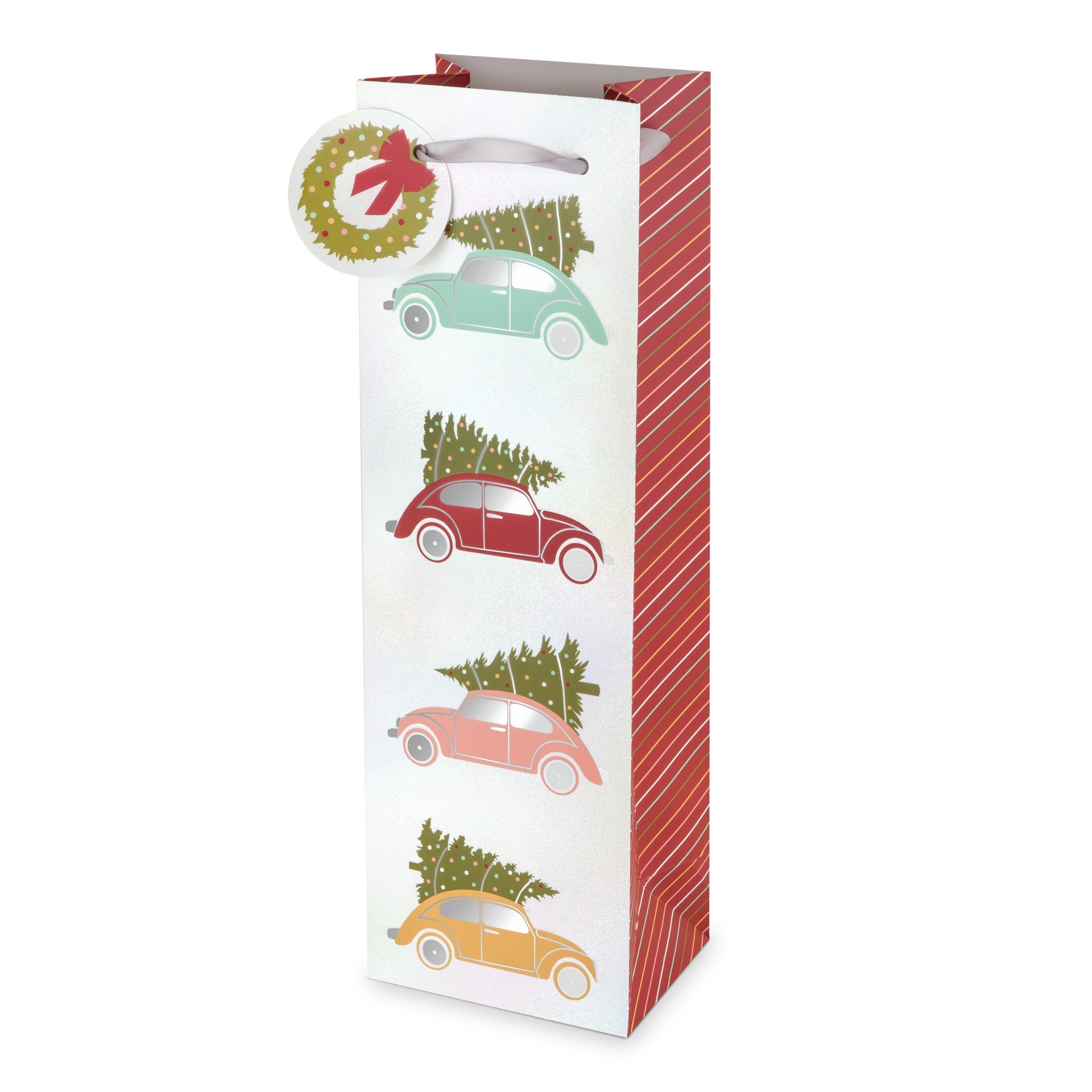 Bring the holidays home with this whimsical wine bag, decorated with four colorful Christmas tree-toting cars and complete with a coordinating evergreen wreath gift tag. Each car''s windows, hubcaps a…