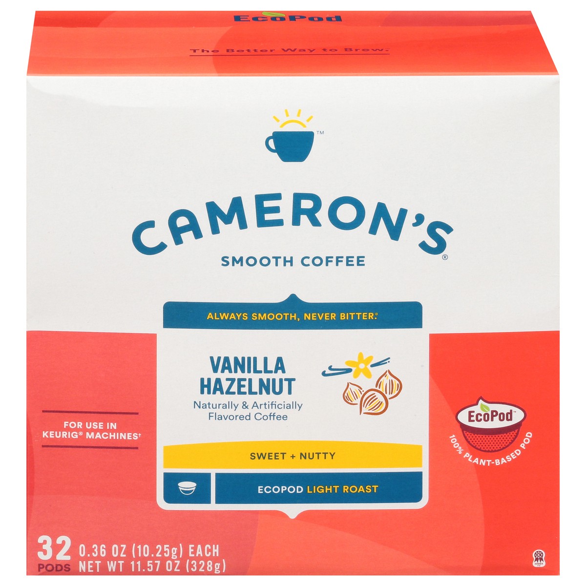 Cameron's Coffee Single Serve Pods, Flavored, Vanilla Hazelnut, 32 Count. This light roast coffee brings flavors of rich, sweet vanilla and buttery hazelnut to your morning mug. Cameron's uses 100% pr…