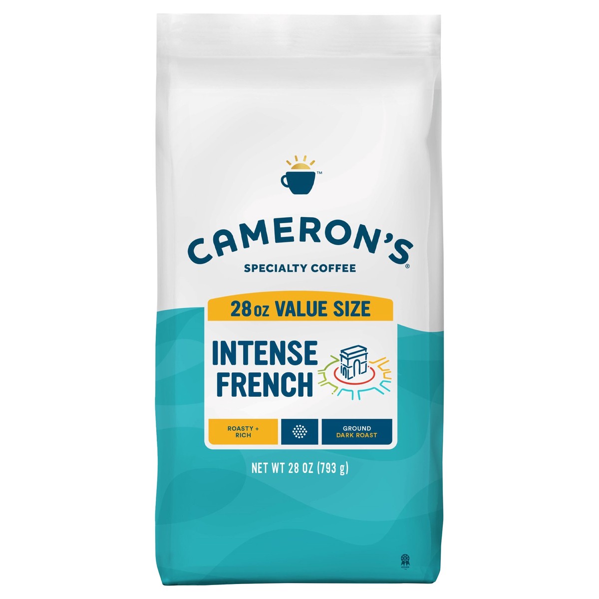 Cameron's Coffee Ground Bag, Intense French, 28oz. The finest Sumatran, Central and South American beans roasted to a black, shiny finish. Cameron's uses 100% premium Arabica beans, hand-crafted to pe…