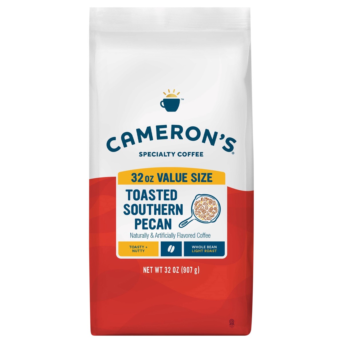 Cameron's Coffee Whole Bean Bag, Flavored, Toasted Southern Pecan, 32oz. Show your best hospitality by serving this smooth coffee with the taste of sweet, toasted Georgia pecans. Cameron's uses 100% p…