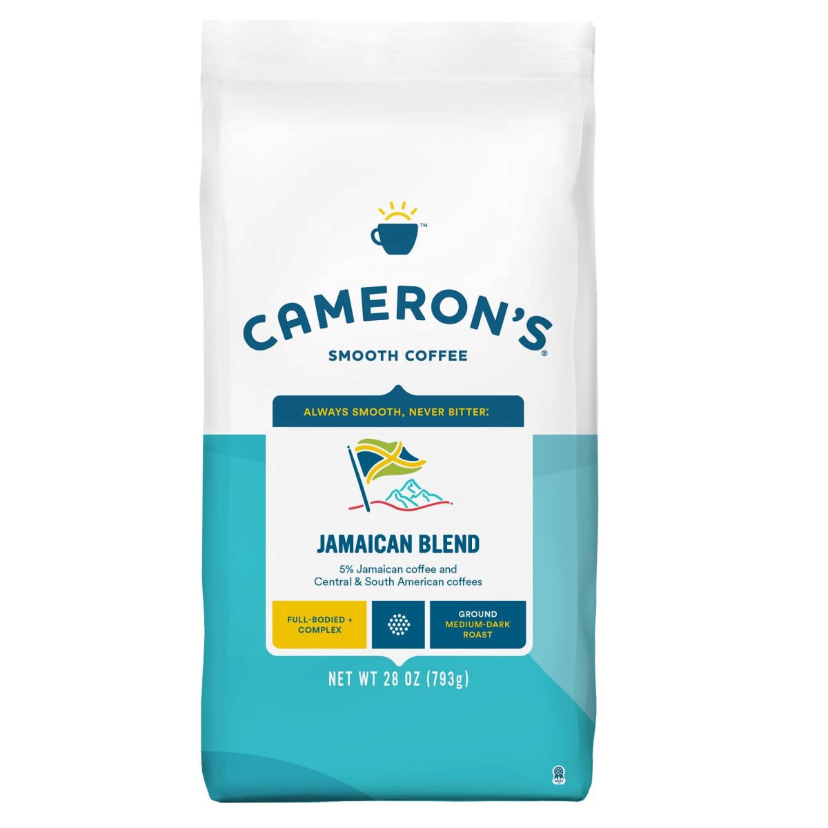 Cameron's Coffee Ground Bag, Jamaican Blend, 28oz. This unique Jamaican coffee blended with Central & South American beans brings a complex flavor and delicate spiciness with hints of chocolate to fil…