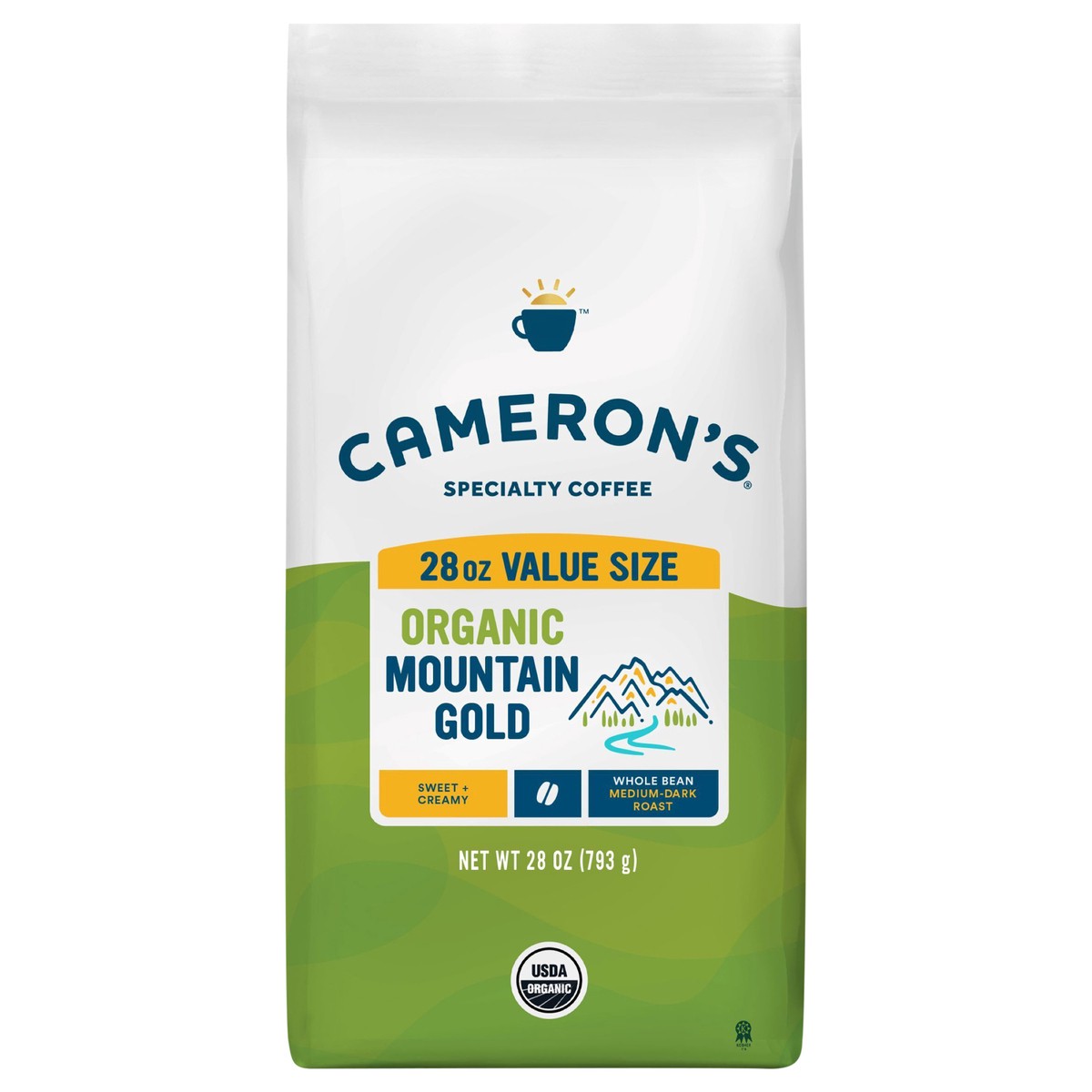 Cameron's Coffee Whole Bean Bag, Organic Mountain Gold, 28oz. YYou'll move mountains for this organic blend! Mellow and sweet with chocolate notes, a creamy body and a clean finish. Cameron's uses 100…