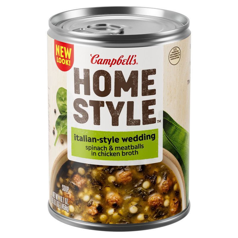 Enjoy the familiar tastes of home with every spoonful of Campbell's Homestyle Italian Wedding Soup. Made with meatballs, spinach, romano cheese and pasta in chicken broth, our hearty Italian-Style Wed…