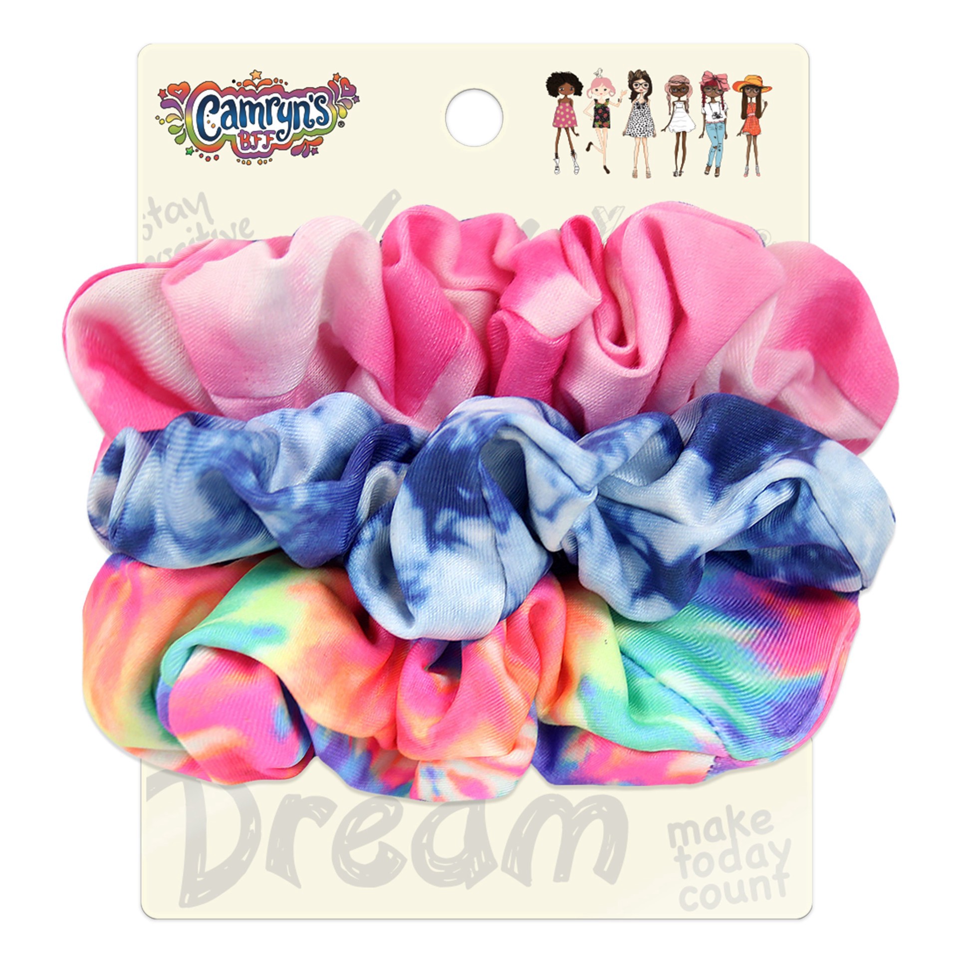 This Camryn's BFF set of tie-dye scrunchies helps dazzle the day and add a fun touch to your little one's look. Great for wearing in hair or around her wrist for impromptu up-do's.• 3-count tie-dye sc…