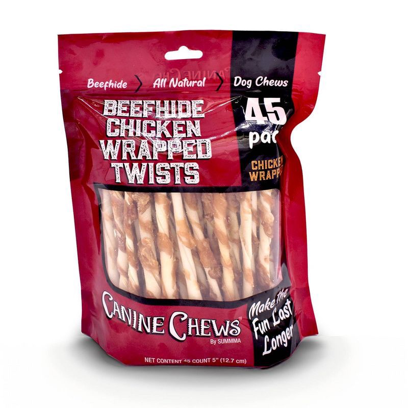 Canine Chews by Summma satisfies your dog's need to chew. These chicken wrapped twists are a great option for a small dog that really likes their rawhide! The chewing action helps in cleaning the plaq…