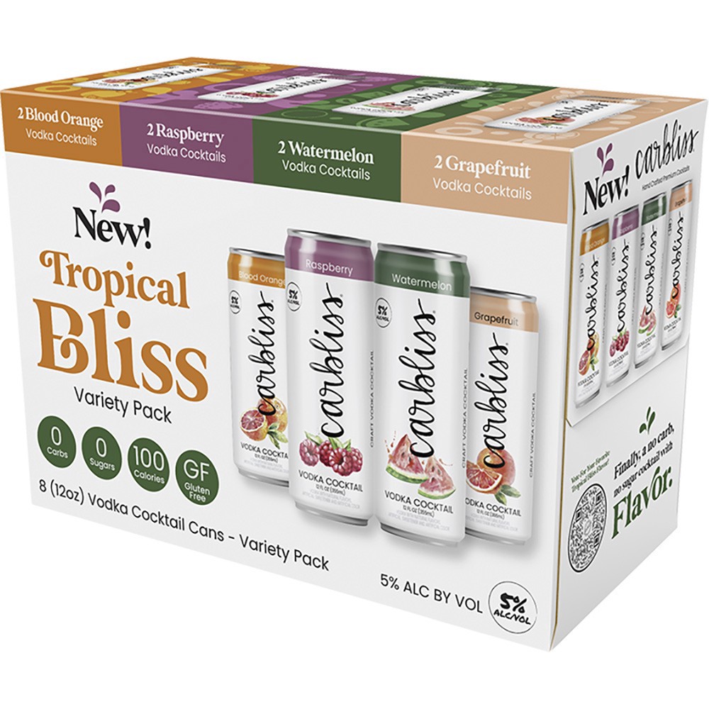 United States - Wisconsin - The newest addition to the Carbliss variety pack lineup that includes: Blood Orange, Raspberry, Watermelon, and Grapefruit vodka cocktails. Carbliss is zero sugar, zero car…