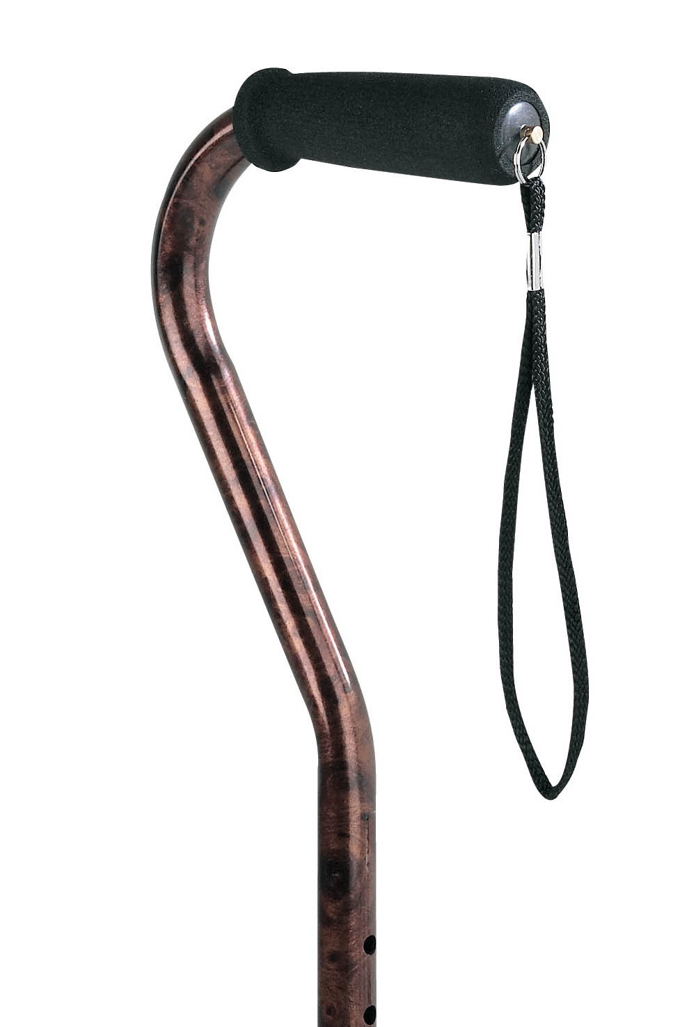 The Carex Offset Designer Cane (Bronze), #A51700, features a soft cushioned handle with a convenient wrist strap to provide better comfort and grip. The height is easily adjusted with the push of a bu…