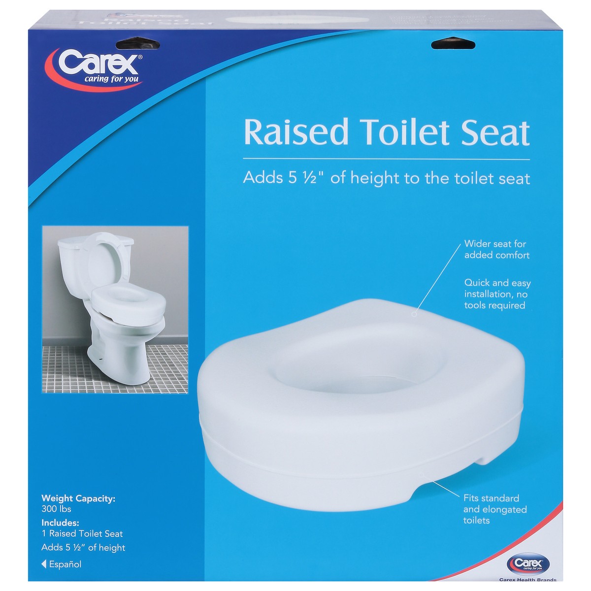 Caring for you. Adds 5-1/2 in of height to the toilet seat. Wider seat for added comfort. Quick and easy installation, no tools required. Fits standard and elongated toilets. The Carex Raised Toilet S…
