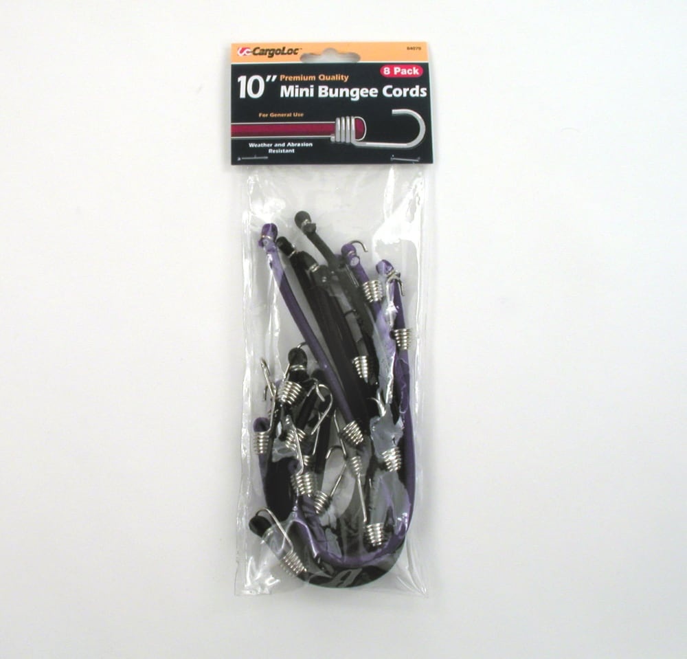 CargoLoc's 8-piece 10" MINI BUNGEE CORDS are perfect for general use around the home, workshop, camping and more. Weather resistant Abrasion resistant 10" 8 bungee cords included