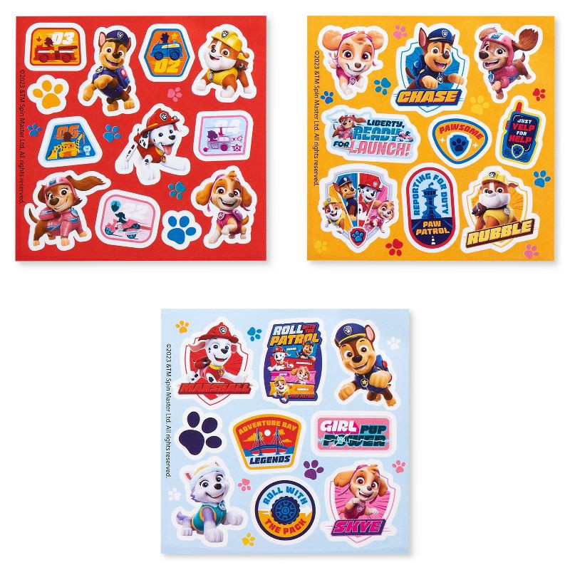 - Sticker sheets feature a variety of Paw Patrol characters.