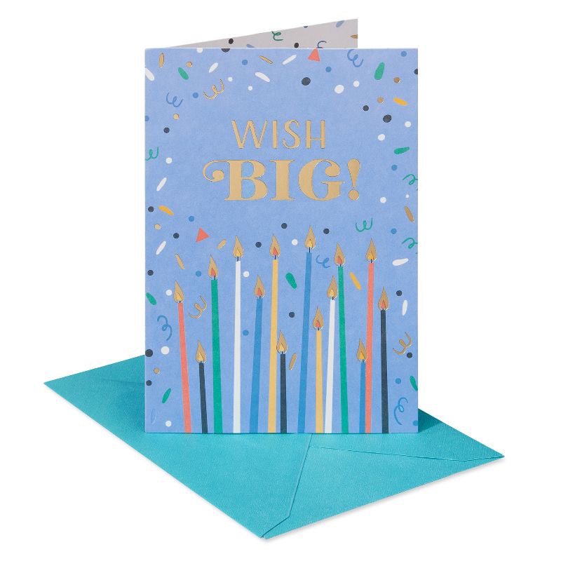 - This American Greetings Birthday card features candles with falling confetti accented with gold foil.