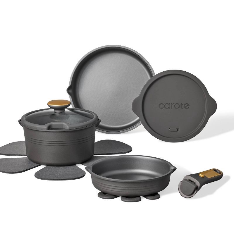 Bring timeless style and everyday function to your kitchen with the Carote 10-Piece Nonstick Detachable Cookware Set in black with gold PVD accents. The set includes 2 skillets, a saucepan with lid, p…