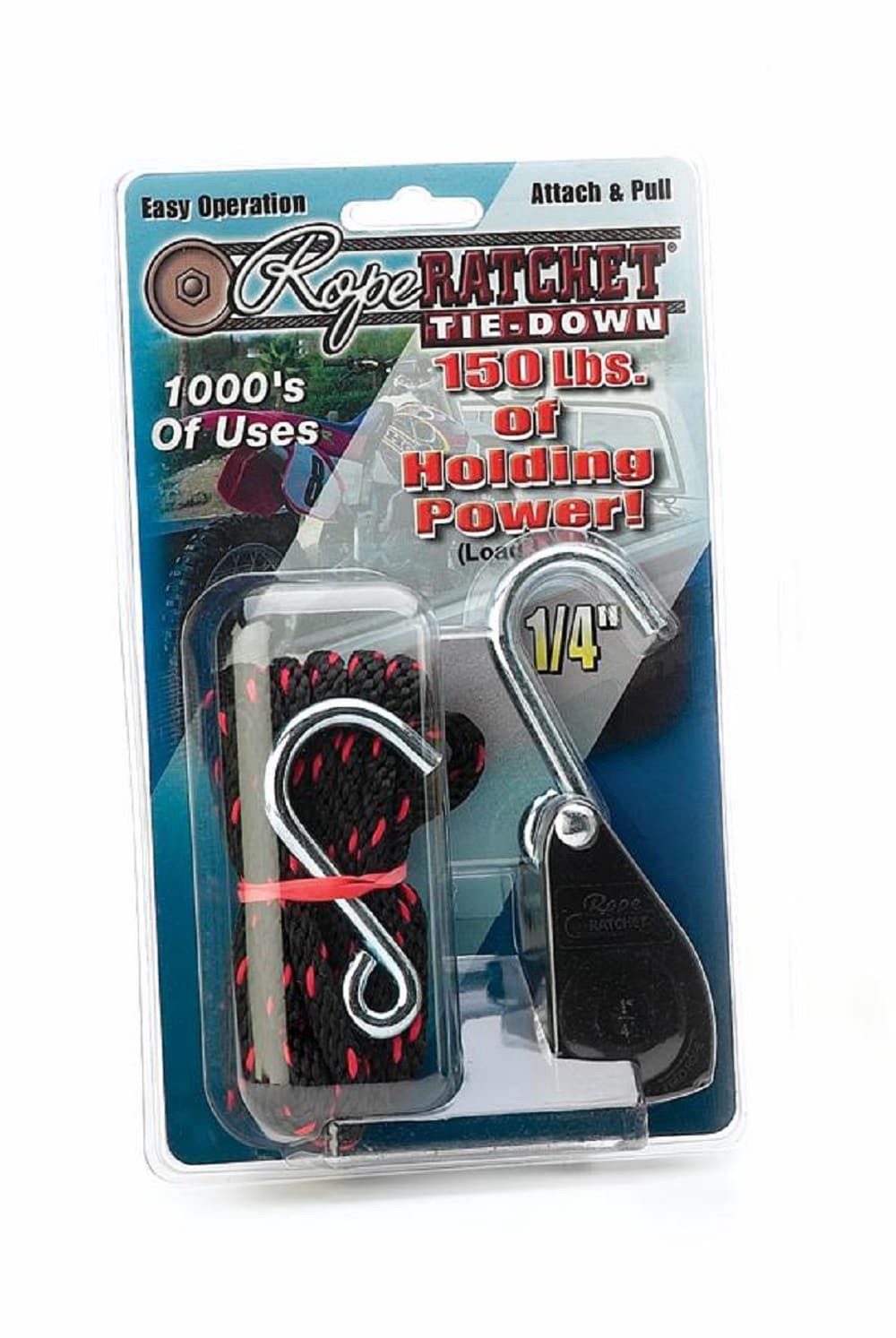 Load Capacity of 150 pounds. All metal levers and gears. Package includes 8 feet of 1/4 in solid braided rope, 1/4 in rope ratchet and 1/4 in S-hook.