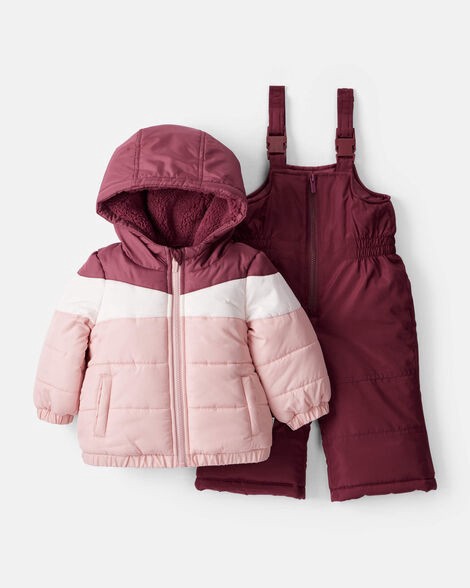 Carter's Baby Girl 2-Piece Color Block Hooded Snowsuit Jacket & Bib Set - Pink/Red Maroon 24M