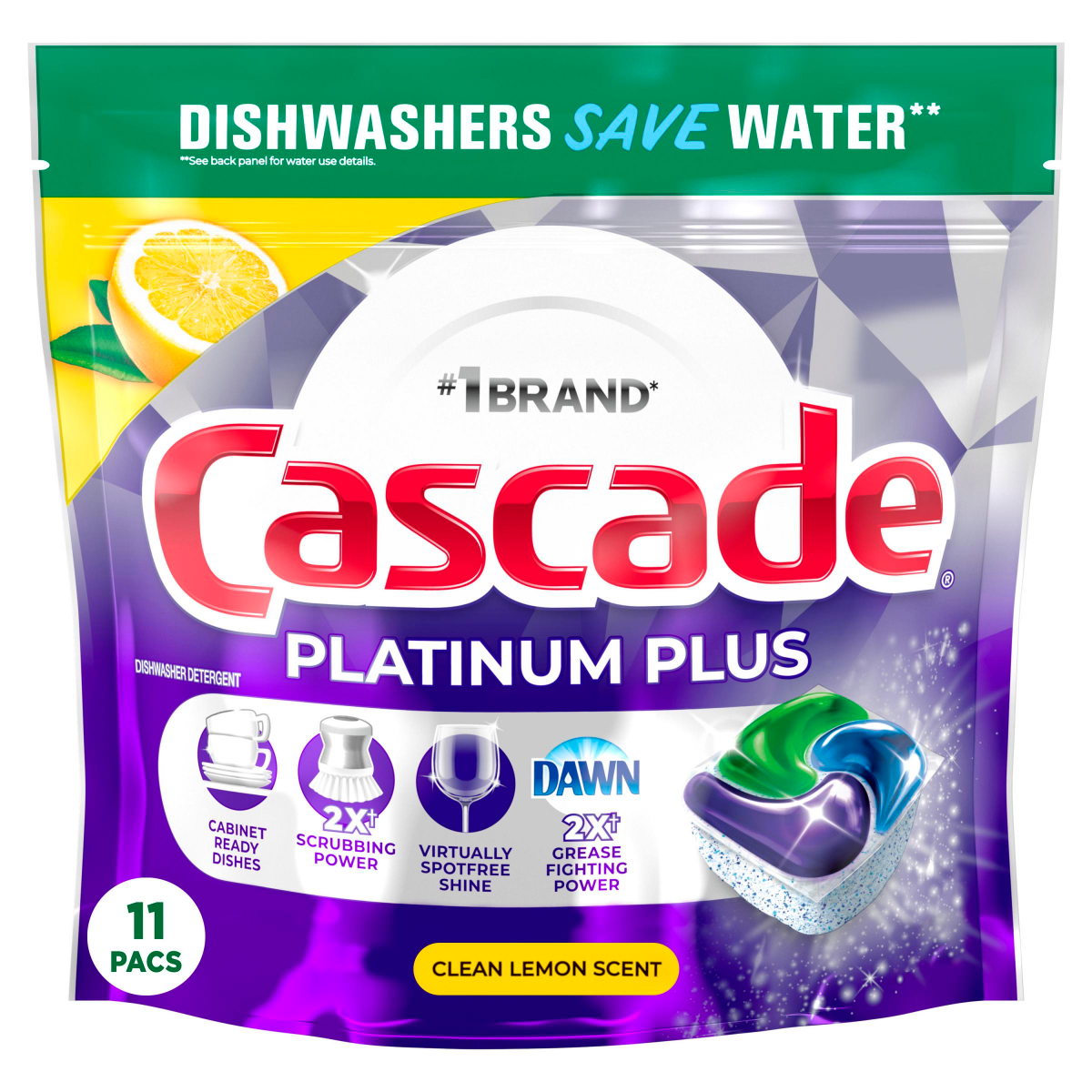 Cascade Platinum Plus ActionPacs dishwasher detergent gives your dishes a breakthrough, cabinet ready clean. Loaded with 2X* the Dawn grease fighting power, and 2X* the tough food scrubbers, it has so…