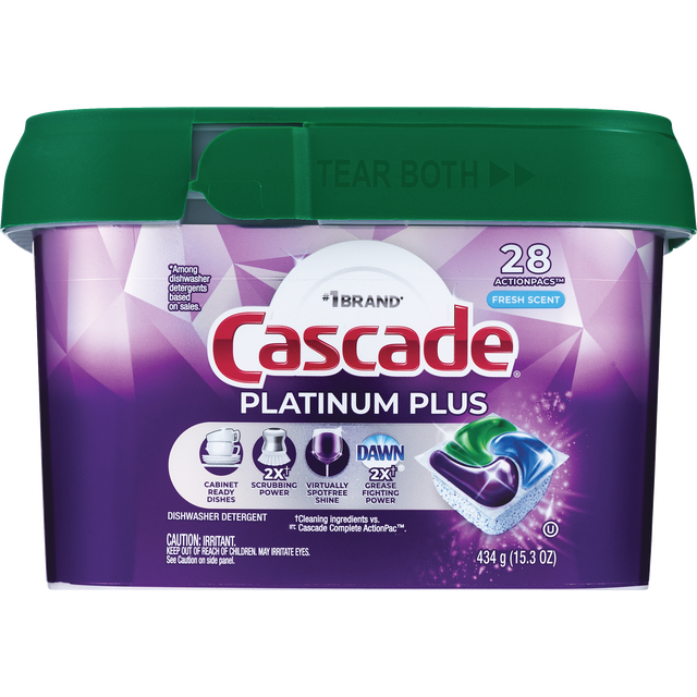 Cascade Platinum Plus ActionPacs dishwasher detergent gives your dishes a breakthrough, cabinet ready clean. Loaded with 2X* the Dawn grease fighting power, and 2X* the food scrubbing power, it has so…