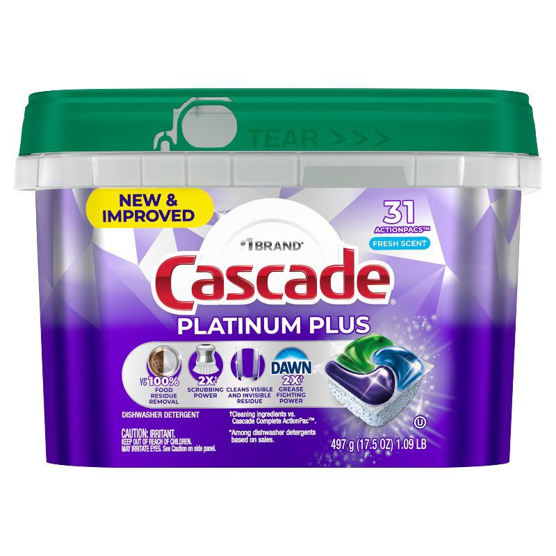 New and Improved Cascade Platinum Plus ActionPacs dishwasher detergent gives your dishes a breakthrough clean with up to 100% food residue removal. Loaded with 2X* the Dawn grease fighting power, and …