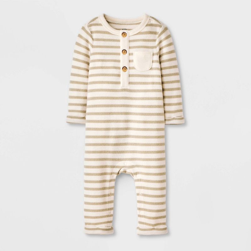 Add cozy comfort to your baby's wardrobe with this Henley Cozy Long-Sleeve Romper from Cat & Jack™. The long-sleeve romper features an allover striped pattern and coverstitch hem to add a cute style t…