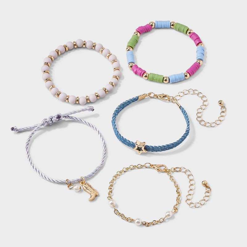 Add a splash of color to any outfit with this Girls' 5pk Western Bracelet Set - Cat & Jack™. Crafted from a mix of polyester, zinc alloy, iron and acrylic, these bracelets offer a delightful blend of …