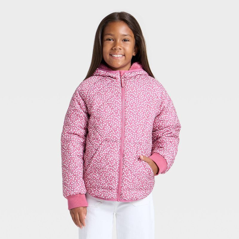 Girls' Floral Printed Hooded Reversible Puffer - Cat & Jack™ Rose Pink XL