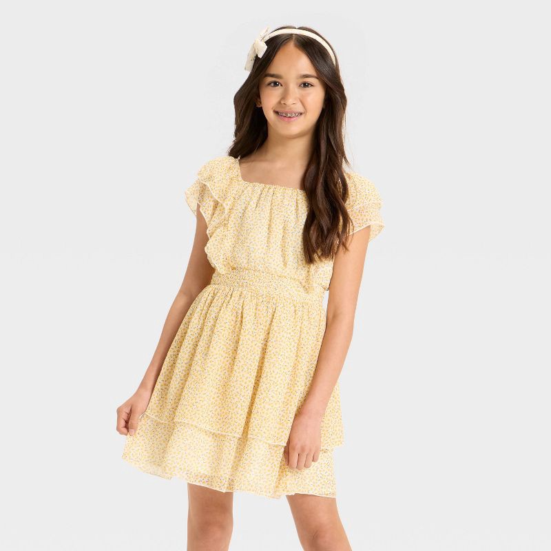 Your kid can bring a playful touch to their casual outfits with the Floral Tiered Chiffon Dress from Cat & Jack™. Made from recycled polyester chiffon fabric with lining for comfortable wear, this flo…